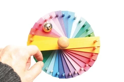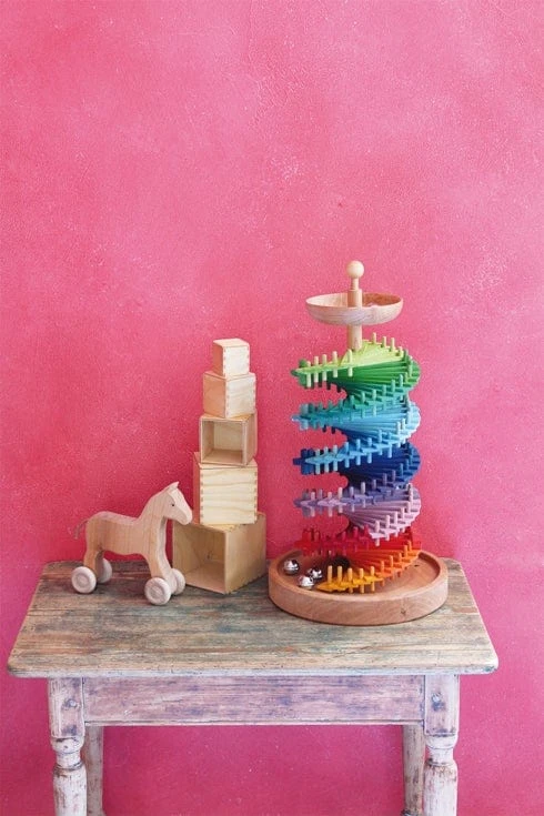 The children may build up this ball run by themselves, sorting the colours as their discretion. Resulting in a double spiral run, one can also have marble races: for example, you let run a wooden bead against the included bell. Who will be the winner? Which ball is the most quit running down the path? Which one makes the most noise? After a while, the ball run can be dissembled and arranged in a different colour set-up, so the fun starts again. If you would like to extend the game, our Wooden Marbles (Art. No 10225) fit perfectly. Contents: 1 base plate of solid wood, 1 center rod, 80 little wood panels with center holes assorted by colour, 176 wooden dowels assorted by colour, 2 spacer sleeves, a start bowl, 1 terminating bead for the center rod, 4 bells.
