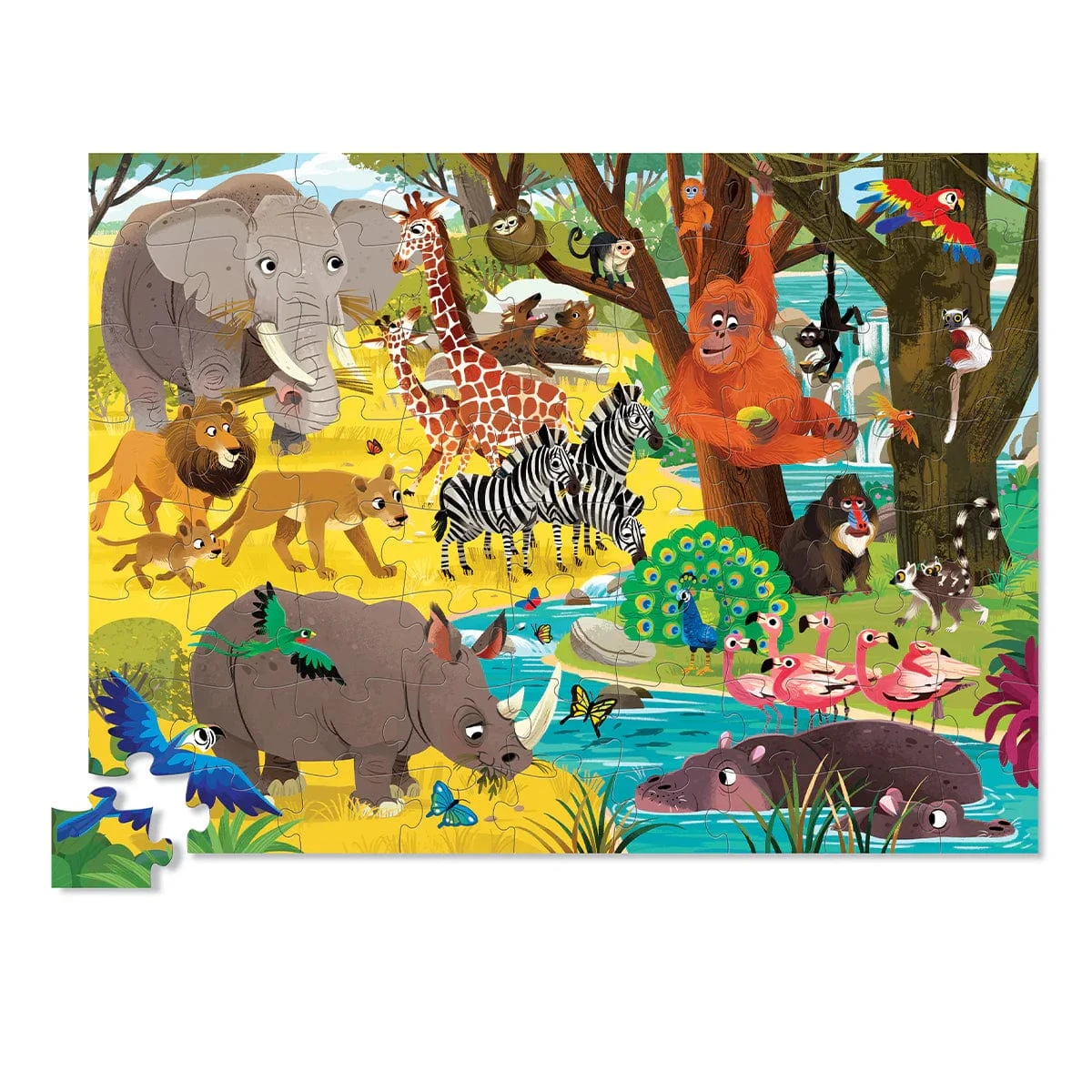 The Wild Safari 72-piece jigsaw puzzle will delight all ages. The 14″ X 19″ Puzzle has beautiful, colorful and complex illustrations. All Crocodile Creek puzzles are printed with soy-based ink on recycled cardboard. Uniquely shaped storage box is study and will keep all the pieces together when the puzzle is not in use.