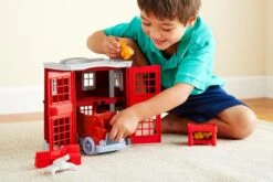 Spark imaginative play with the Green Toys™ Fire Station! This playset has everything your little firefighter needs to save the day, including a fire station, fire engine, firefighter cat characters, rotating water cannon, command center, and stackable bunk beds. Open and close the doors to both the front and back of the station, help the cats slide down the fire pole, and race to the rescue in the fire engine, all while helping to develop fine motor cooperative play skills. All pieces fit inside the fire station, so clean-up and storage is a breeze, and the built-in handle makes it easy to take all the fun on-the-go.