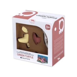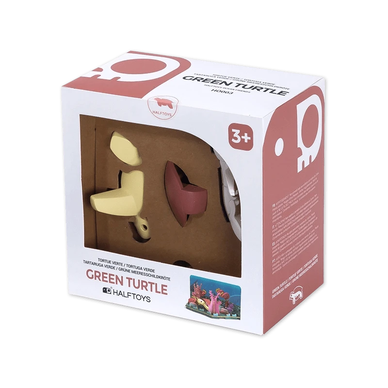 Green turtles are mainly found in tropical and subtropical waters. They are herbivores who graze on seagrasses and algae. Like other turtles, they travel long distances between feeding grounds and the beaches they hatched from. As a halftoy, you can open its magnetic shell to find the skeleton, a 3-piece bone puzzle. Each animal figure comes with a diorama that can be linked to other dioramas in the half ocean collection. Collect them all and build a scenic ocean world!