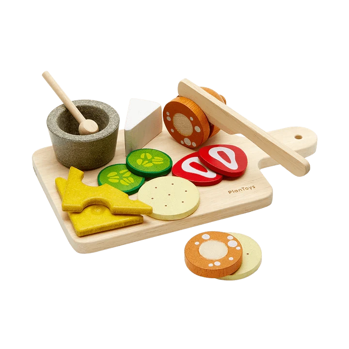 Everyone loves a charcuterie board! With this set, children can prepare a European-style appetizer that’s guaranteed to impress their guests. This set includes 2 pickled cucumbers, 2 strawberries, 2 crackers, 1 block of brie cheese, 2 slices of gouda cheese, 1 sliceable roll of salami, 1 knife, 1 sauce cup, 1 spoon, and 1 cutting board. Expand upon the meal with other PlanToys pretend foods and kitchenware.