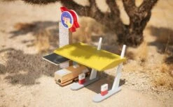 We understand the urge to hit the dusty trail and find adventure. But eventually, you need a break and refuel. Travelers from around the world (and out of this world) are welcome to recharge, buy a snack, and top off their jerry cans at ROCKET FUEL – Intergalactic Gasoline! No glue or tools are required. Assembly time is measured in seconds.
