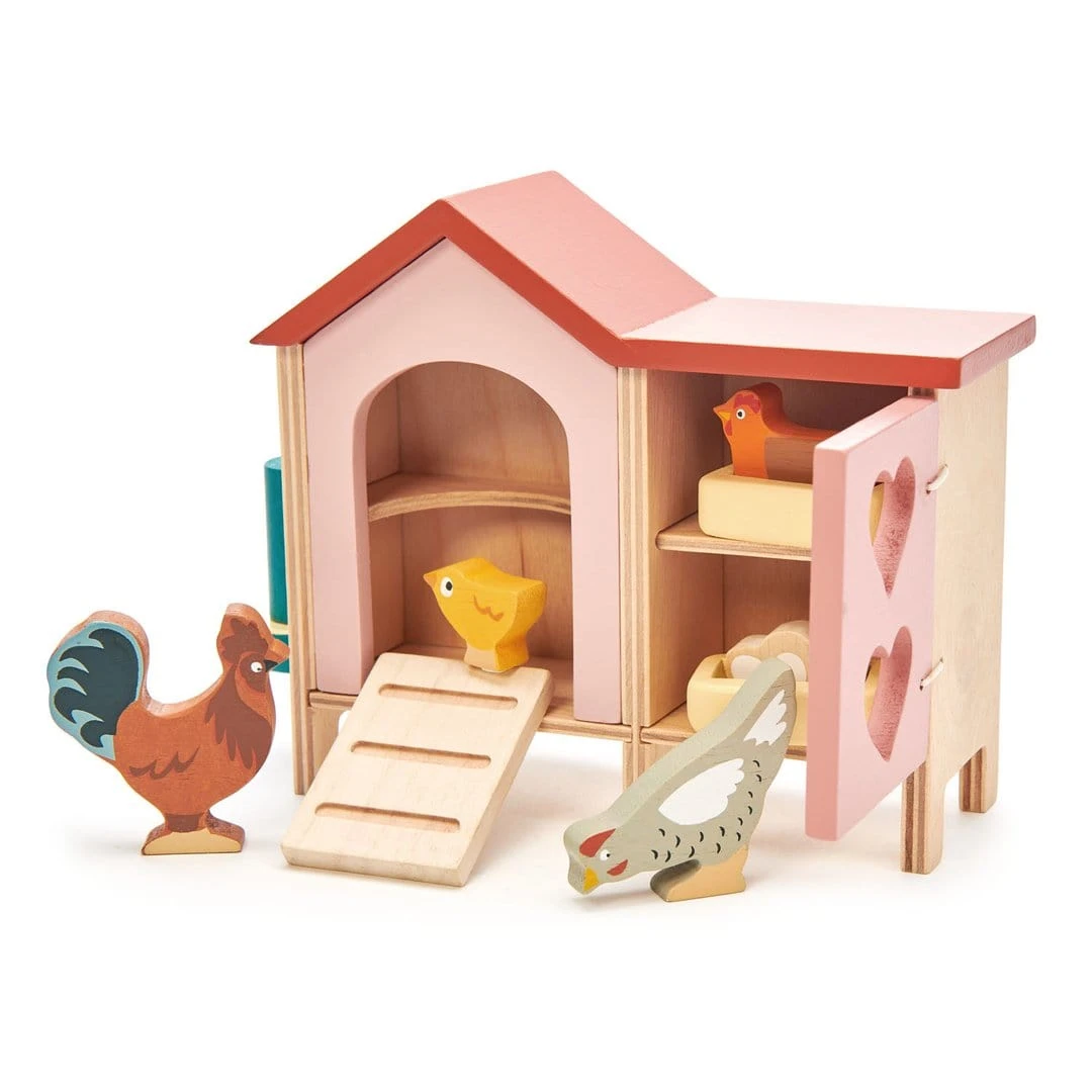 A sweet wooden chicken coop and family; a rooster, 2 hens, a little chick, freshly laid eggs, 2 nests, and a feeding trough.