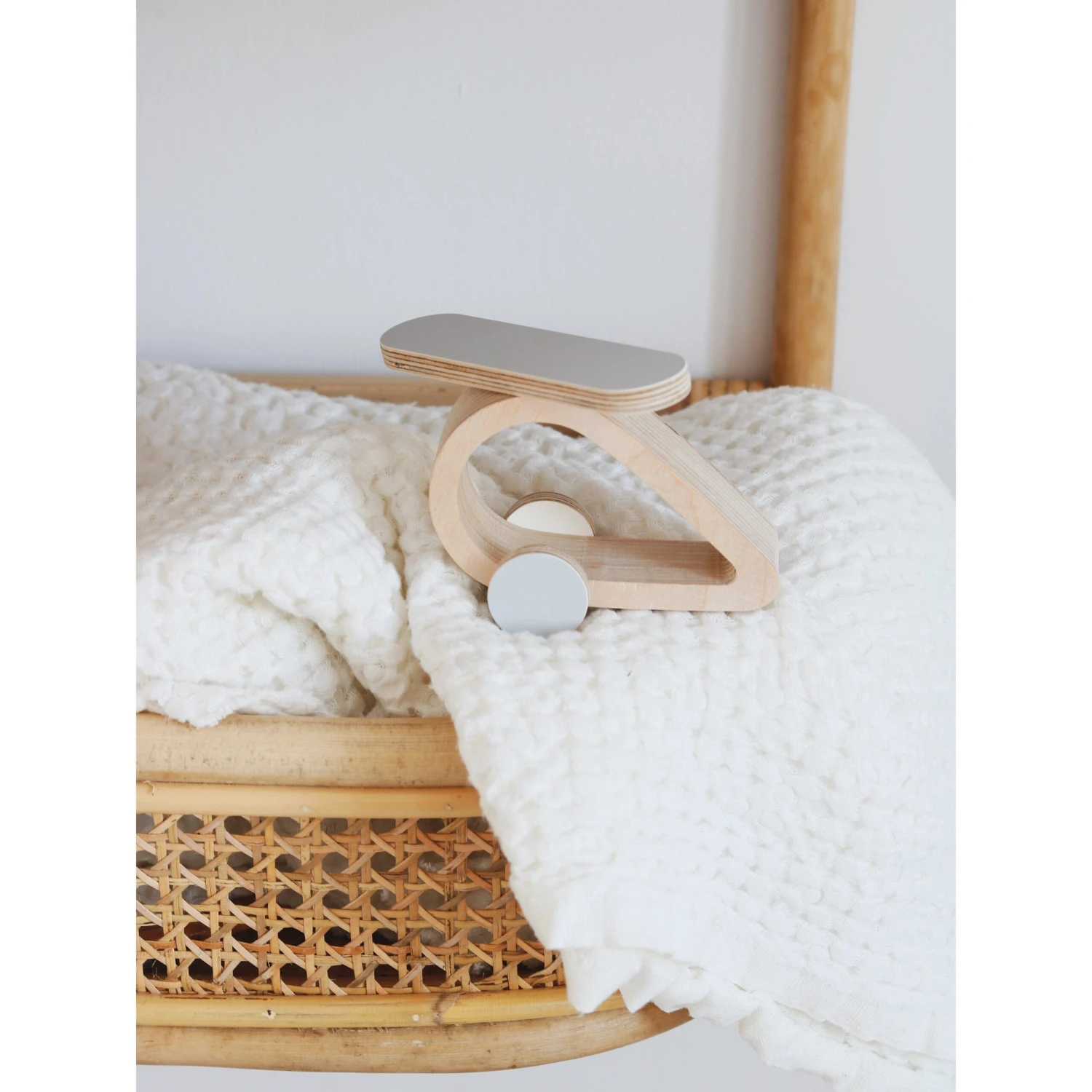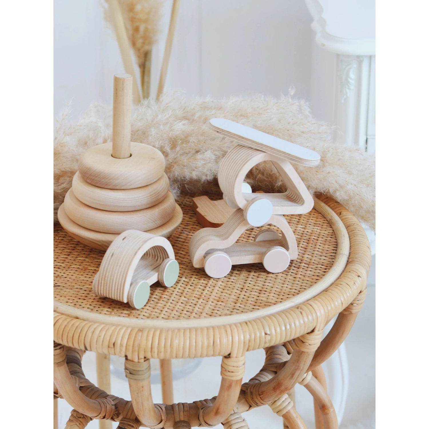 For the garage, we have designed 3 minimalistic cars made of thick plywood. The wheels can spin. Each vehicle has wheels in a distinctive colour. The product is coated with a safe water varnish. It has a perfectly smooth finish. It is packed in a printed box made of kraft paper.